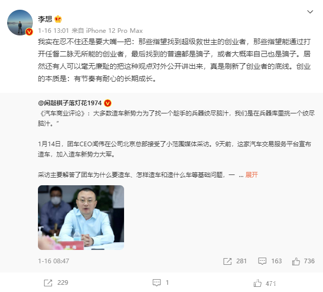 李想就是其中之一。儘管團車網官宣進入造車領域時,還曾在微博@蔚來、理想、小鵬,但李想的回覆可謂是一點不留情面。