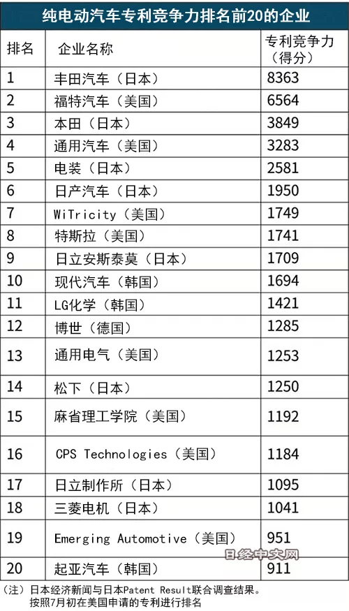 日本經濟新聞公佈的純電汽車專利競爭力排名前20的企業中,日本企業更是遙遙領先。
