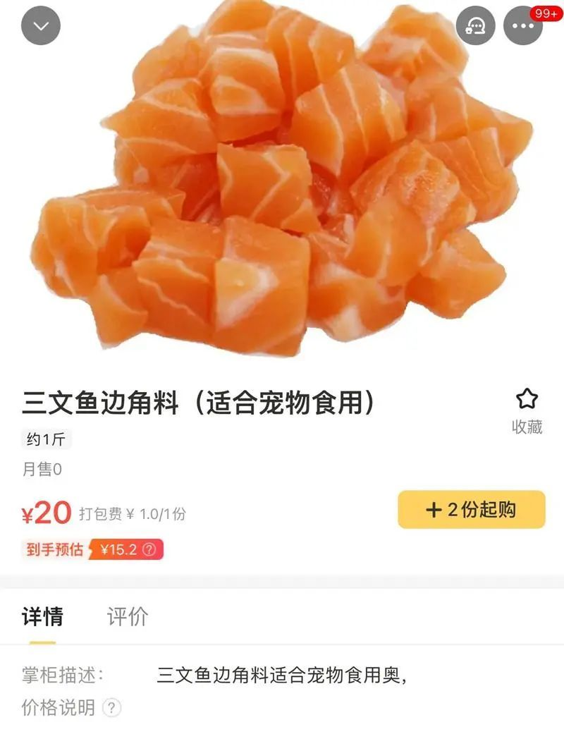 除了蛋糕店,有的三文魚店也會賣邊角料。南京秦淮區一家專賣三文魚的店鋪,一斤邊角料價格為20元,而這家店售賣的切片三文魚,8片售價130元。另一家三文魚店老闆表示,邊角料可以贈送給顧客,大多數人用來喂寵物。