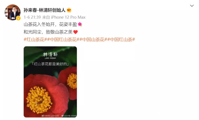 但這一次,輿論給了這個不算年輕的國產護膚品牌重重一錘。宣戰後的第三天,孫來春的微博上發了這樣一張宣傳圖,火紅的山茶花下寫着“紅山茶花都是美好的”,寒冷的冬天恰好正是山茶花的花期。