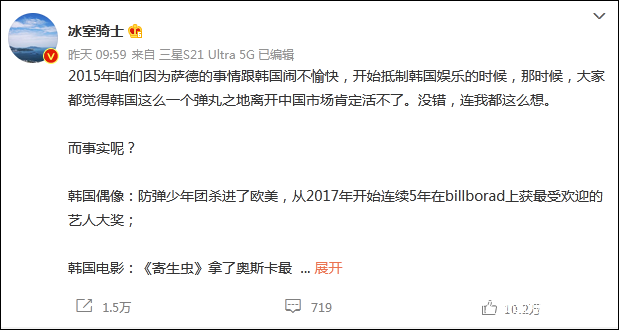 2015年咱們因為薩德的事情跟韓國鬧不愉快,開始抵制韓國娛樂的時候,那時候,大家都覺得韓國這麼一個彈丸之地離開中國市場肯定活不了。沒錯,連我都這麼想。