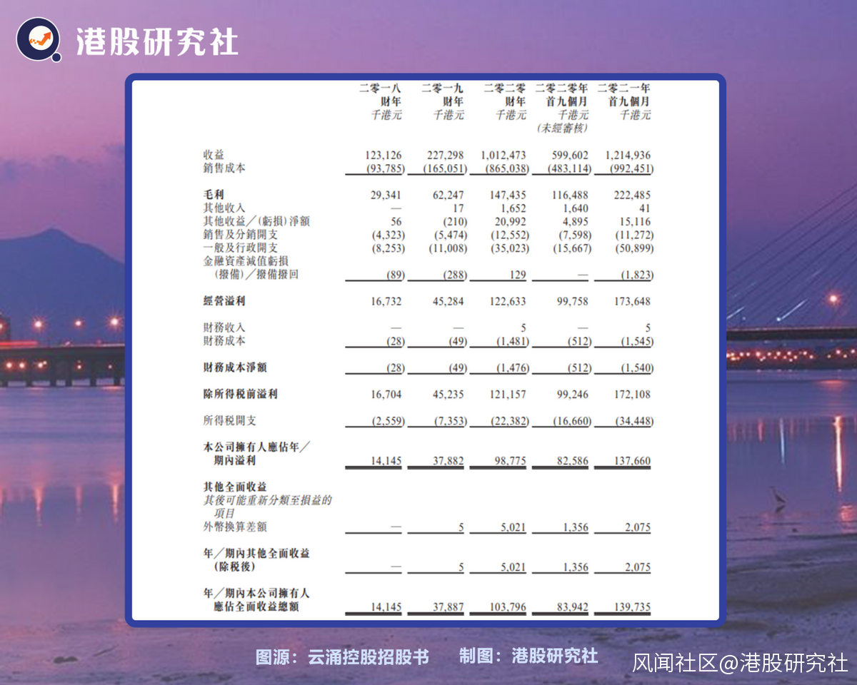 據招股書披露的數據來看,雲湧控股在2018財年、2019財年和2020財年的收益分別為1.23億港元、2.27億港元和10.12億港元,複合年增長率約為186.8%。再對比2020年首9個月(收益約6億港元)和2021年首9個月(收益為12.15億港元)的數據,可以看出,近兩年,雲湧控股的收益有很大的提升。