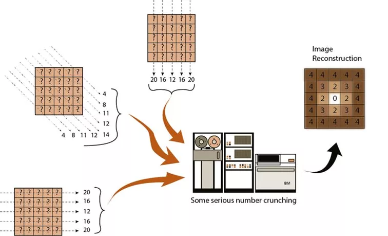 最後,在亨斯菲爾德最具獨創性的發明中,有一種可以基於所有切片重建大腦圖像的算法。利用當時最快的新計算機之一進行逆向計算,他可以分析出每層大腦切片的每個小方塊的值。成了!