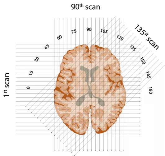 x射線以半圓形從1到180度的角度照射到大腦的各個“切片”。Edmund S. Higgins, CC BY-ND
