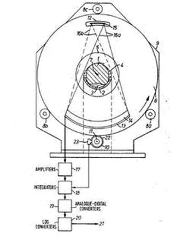 亨斯菲爾德的美國專利中包含的CT掃描儀示意圖。Godfrey Newbold Hounsfield