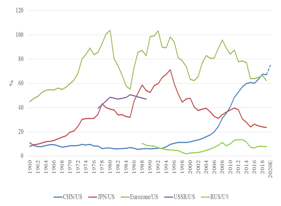 如圖所示,二戰結束以來,美帝國的各個挑戰者的GDP,鮮有能追平美國的。蘇俄和日本的曲線很值得玩味。歐元區是個例外,因為它並非一個主權國家,沒有統一財政,也無獨立的外交和國防政策,所以其GDP接近美國並沒有引發太強烈的戰略反彈。歐元區的GDP相對於美國,基本上在80%上下波動。而未來十年內中國實質性超過美國,將是百年未有之大變局。而根據世界經濟活動分佈的冪率規則,一旦中國超過美國,中美GDP之比必然繼續上衝到150%乃至200%才會達到某種均衡狀態。