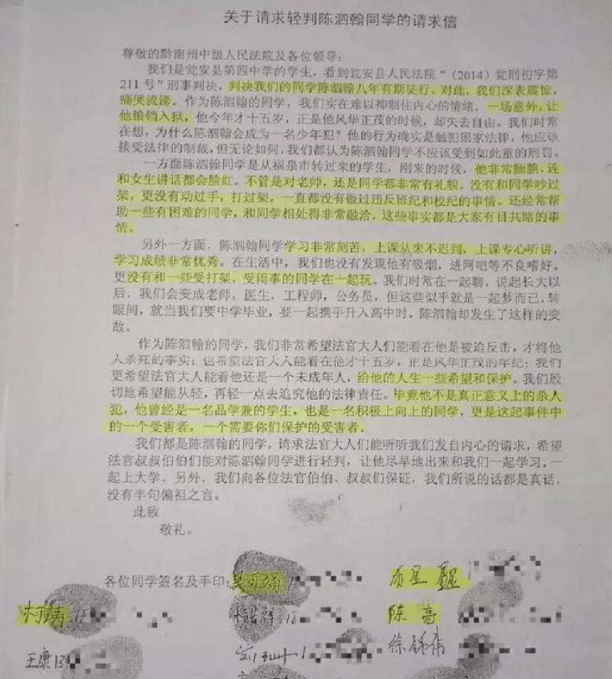 信中稱:“我們非常希望法官大人能看在他是被迫反擊,才將他殺死的事實,更希望考慮到他是未成年人,給他的人生一些希望和保護。”