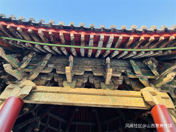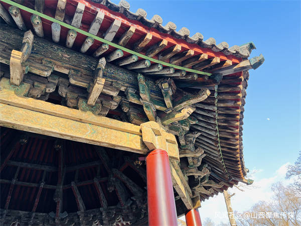 屋檐下的斗拱為三踩斗拱,每柱頭設置斗拱一攢,角科斗拱採用斜栱做法,正面伸出三踩翹頭,左右也伸出翹頭,承託上方耍頭和檐檁。平身科位置設置斗拱兩攢,從大斗口內水平伸出如意式昂頭,其上承託廂栱,交螞蚱式耍頭承託麻葉頭支撐檐檁。