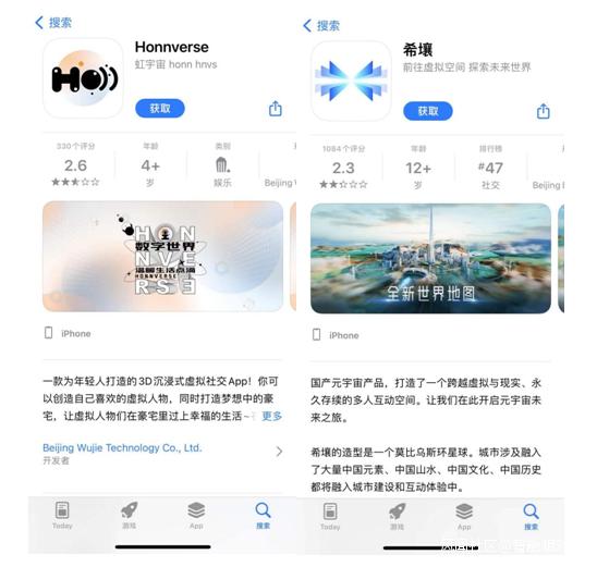 目前,國內兩款已上線的元宇宙產品在蘋果App Store上都反饋一般,百度的“希壤”評分2.3分,天下秀的“虹宇宙”為2.6分,未達用户預期。
