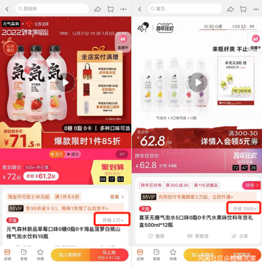 《螳螂觀察》分別查詢了元氣森林和喜茶店內銷量最好的氣泡水的月銷,發現二者雖有差距,但並不算太大。