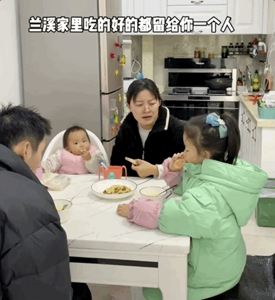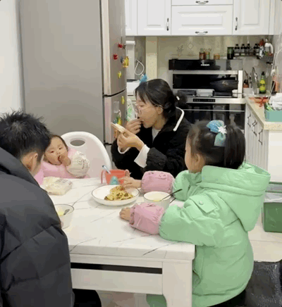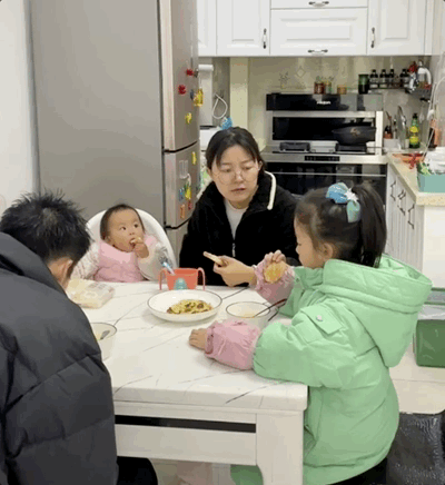 吃早飯時,媽媽和妹妹坐在一邊,方便照顧妹妹吃飯。而大寶單獨坐在另一邊,自己獨立吃飯。