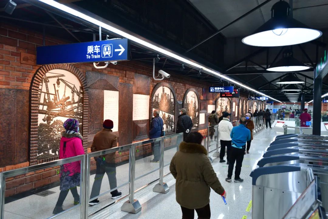 2021年12月26日,地鐵5號線開通試運營。市民在紅鋼城站站廳觀賞藝術牆。記者李永剛 攝