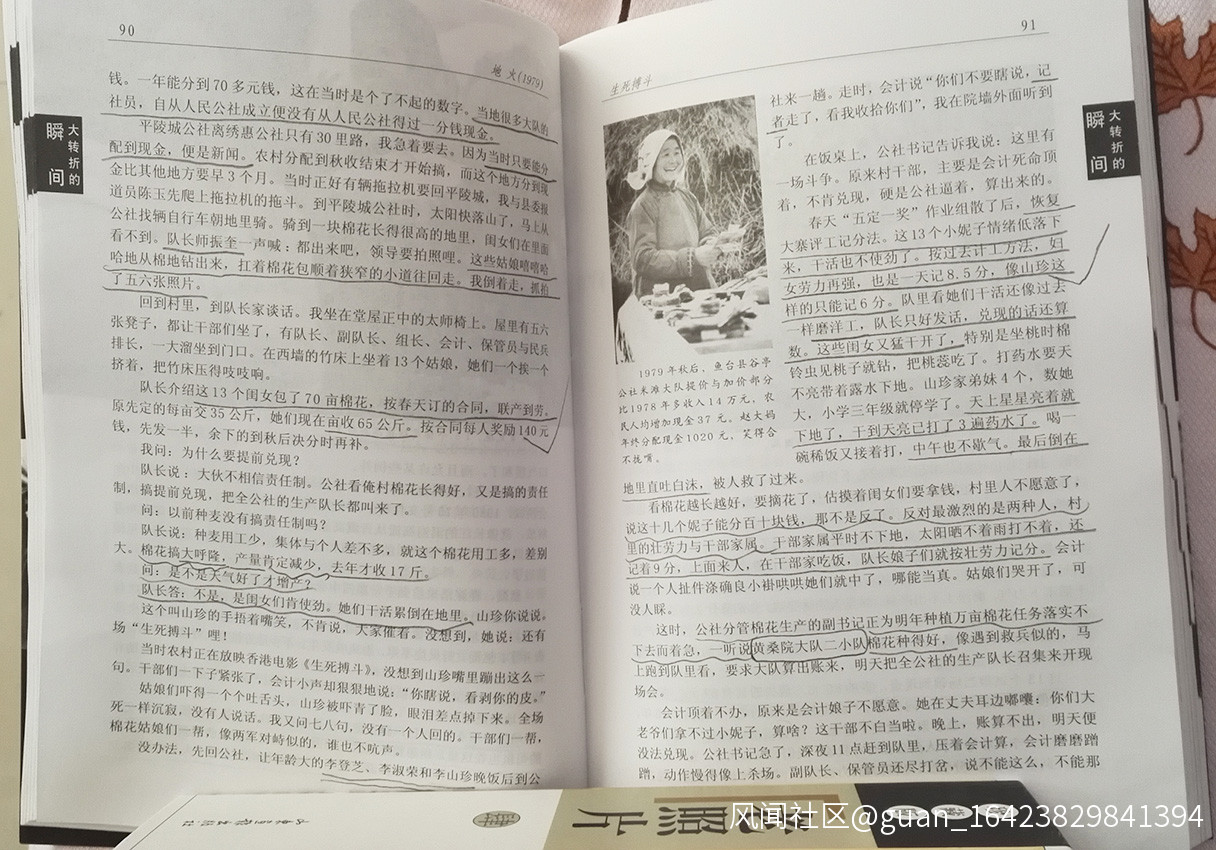 1979年9月30日,我正在章丘縣繡惠公社路邊飯店吃飯,很多交糧的司機也在這裏(樓主附註:章丘縣就是現在的山東省濟南市章丘區,而“我”——即該書的作者李錦是新華社的記者)。繡惠糧庫較大,周圍幾個公社都把糧食運到這裏來。有一個從平陵城公社來的司機説,有一個大隊植棉的閨女每個人分到70多元錢。一年能分到70多元錢,這在當時是個了不起的數字。當地很多大隊的社員,自從人民公社成立便沒有從人民公社得過一分錢現金。