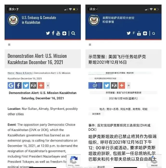然而,對於哈薩克斯坦的亂局,美國駐哈大使館卻似乎早已未卜先知,去年12月16日,其就發出了對美國公民的警示,內容明確指出哈反對派計劃在幾個大城市的具體地點發動示威活動。