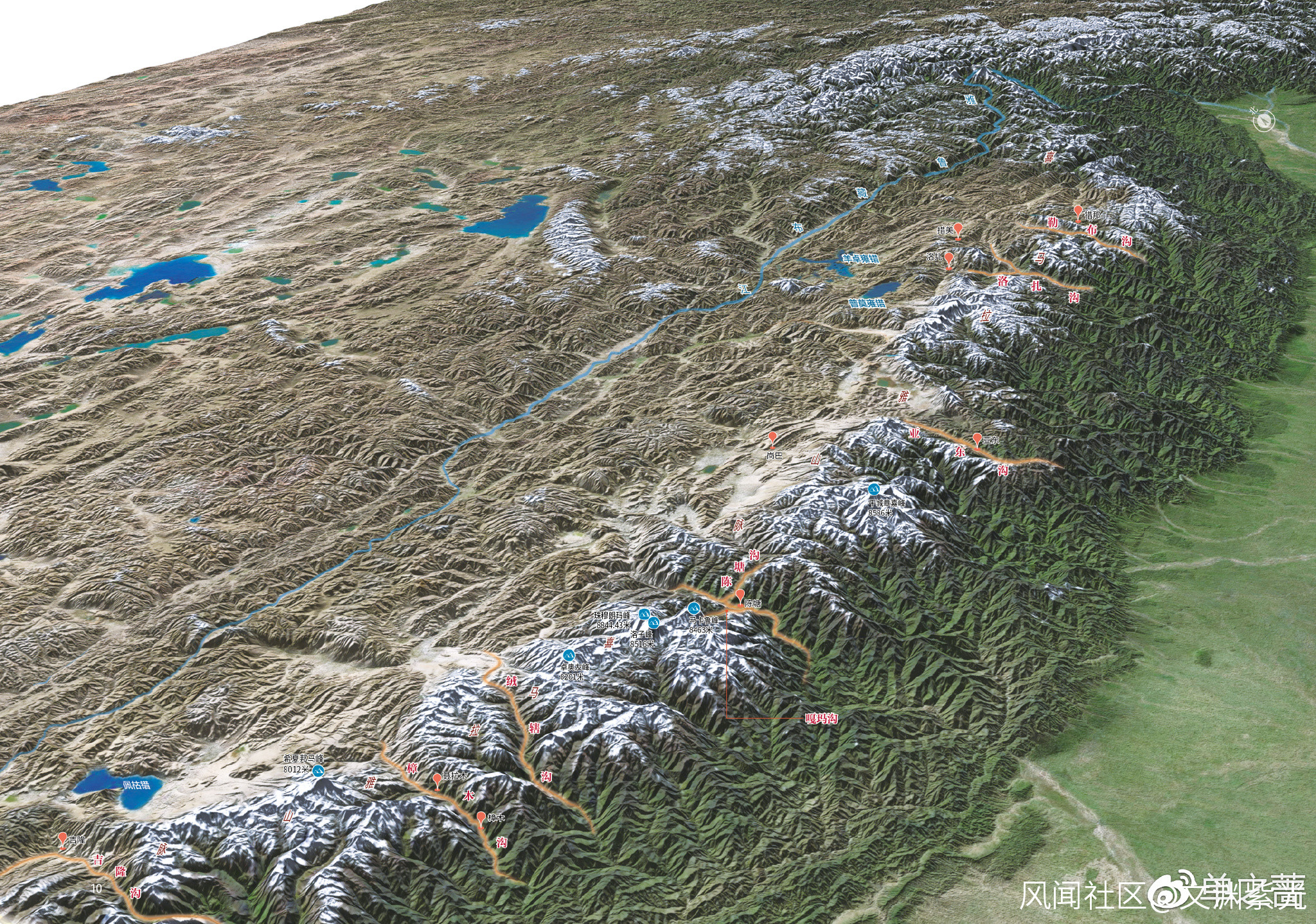 河谷切穿喜馬拉雅山脈,分割出山峯羣。