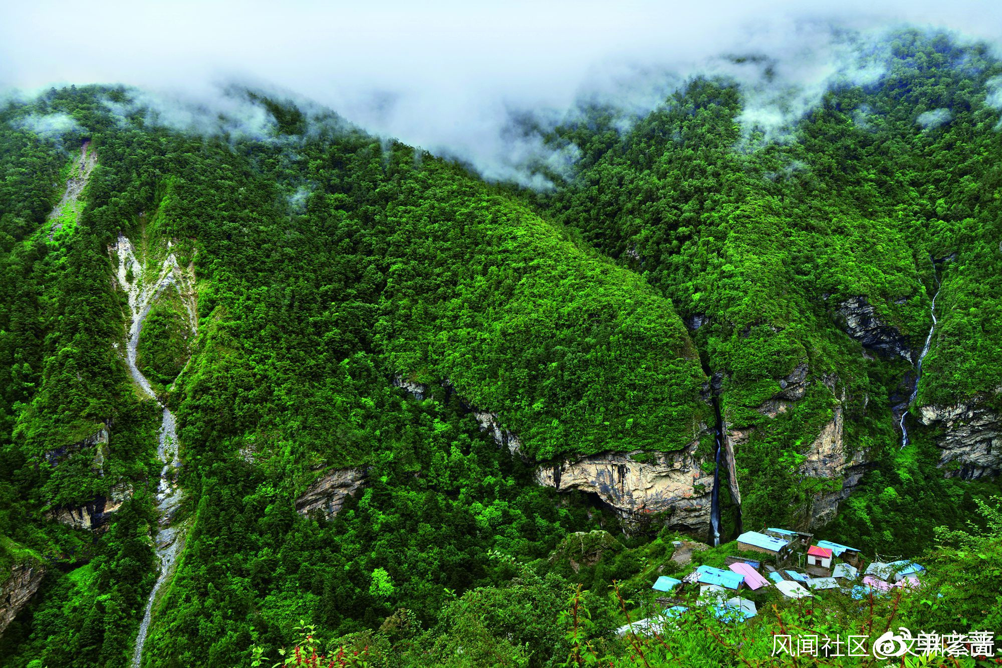 ▲絨轄溝臨近卓奧友峯,科西河的支流從河溝中流過,帶着喜馬拉雅山的冰雪融水穿過尼泊爾匯入印度恆河。溝裏山清水秀,雲霧繚繞,村落修建在山崖邊,一副世外桃源的景象。
