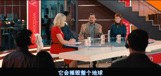 在官方那裏碰壁之後,為了盡最大可能向羣眾示警,電影故事中的男女主角只能選擇上電視直接面對人民羣眾搞科普,然而,更加荒誕的一幕出現了,儘管他們以自己專家的身份,不間斷的強調人類將要面臨的災害會有多麼的嚴重,但卻得不到絲毫重視,嚴重的生存危機直接淹沒在了調侃段子裏……