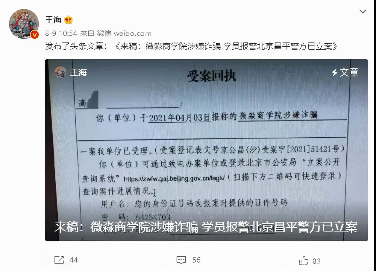 時隔一個月,微淼商學院又吸引了知名職業打假人王海的關注。王海在微博中轉發了投訴者的來稿,文章中稱微淼商學院涉嫌詐騙,學員報警後,北京昌平警方已立案。不久后王海補充道,微淼詐騙已在全國多地警方處立案,為其代言的何潤東作為微淼商學院的體驗官,應承擔連帶責任。