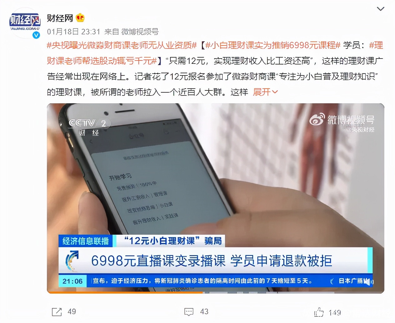 1月18日,據央視財經報道,記者體驗調查發現,微淼12元的“小白理財課”並沒怎麼普及理財知識,而是通過販賣焦慮向學員推薦6998元的課程。而進階課程不僅出現老師對學員們疑問不理睬、退費難等現象,其中的“專業從業人員”也存在問題。