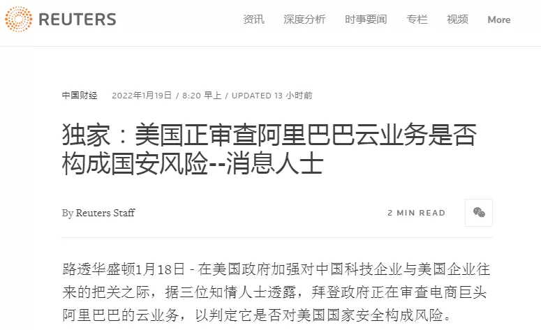 路透社日前刊發了一則獨家稿件,聲稱美國以“國家安全”為由正在審查阿里巴巴為美國企業提供的雲業務是否構成風險。