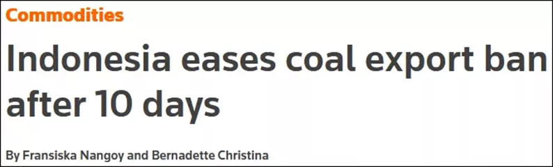 就目前來看,停止煤炭出口僅僅維持了10天,而不是之前宣佈的一個月,印尼海洋事務與投資統籌部長盧胡特(LuhutBinsar Pandjaitan)10號即宣佈,只要獲得礦業和交通部門的核準,該國允許14艘裝載煤炭的船隻起航,煤炭出口禁令就此進一步放鬆。