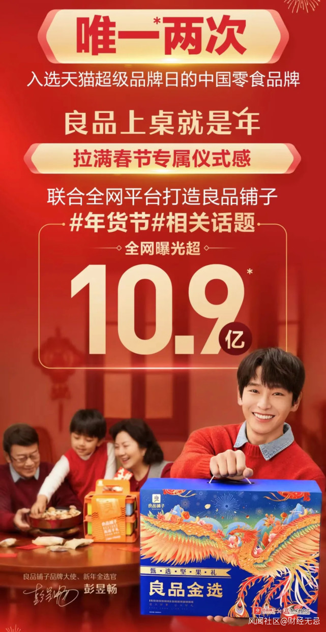 作為品牌與消費者溝通的狂歡日,良品鋪子在天貓超級品牌日期間也在不斷打造年味出圈效應,聯合全網平台打造的#年貨節#相關話題,全網曝光超10.9億,春節專屬儀式感也被直接拉滿。