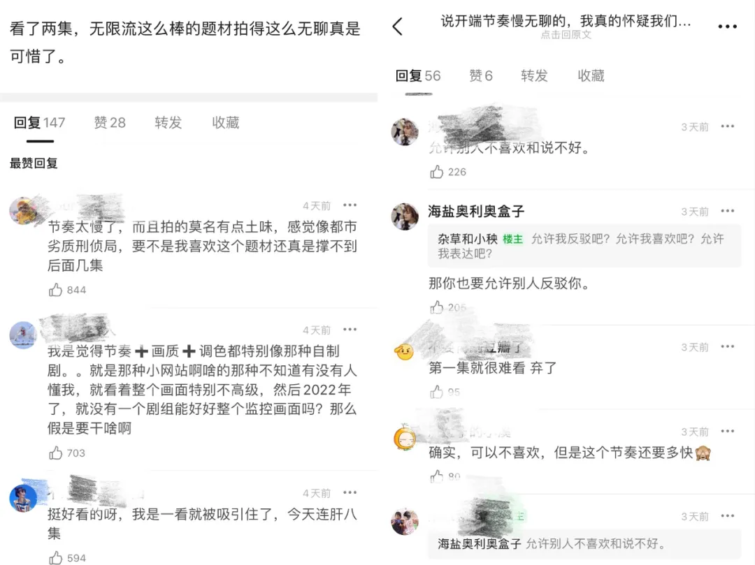 兩極分化的評價,或許代表了國劇兩種典型的受眾:前者是耐心型的,可以接受低信息密度的鋪陳,並樂於對新鋭題材和大牌製作保持包容和期待;後者是即時型的,一旦無法在前期抓住他們胃口,就容易流失。對於那些“説上句就知下句”、能直接腦補的情節,他們更願意劇集直接將其略過不拍,呈現更高能的內容。