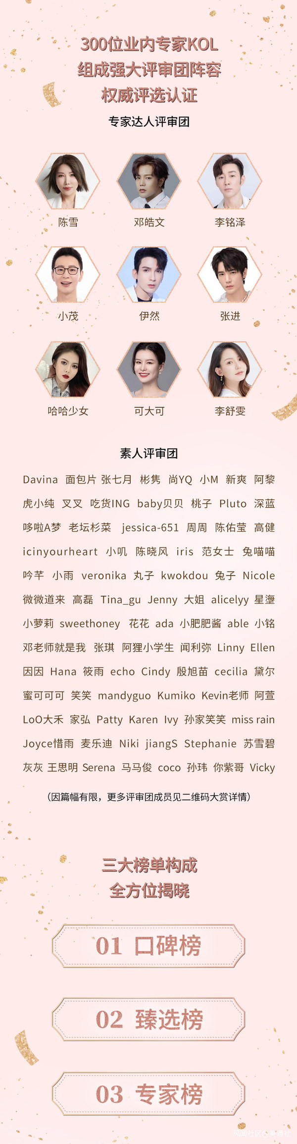 KIMISS閨蜜集結了行業內具有權威話語權的300位專家、KOL權威背書,同時海量吸收素人點評證言,一同評選出年度重量級口碑好物。三大榜單(口碑榜、臻選榜、專家榜)全方位揭曉年度重量級口碑好物。打造備受消費者們信賴且青睞的消費者口碑大賞榜單。