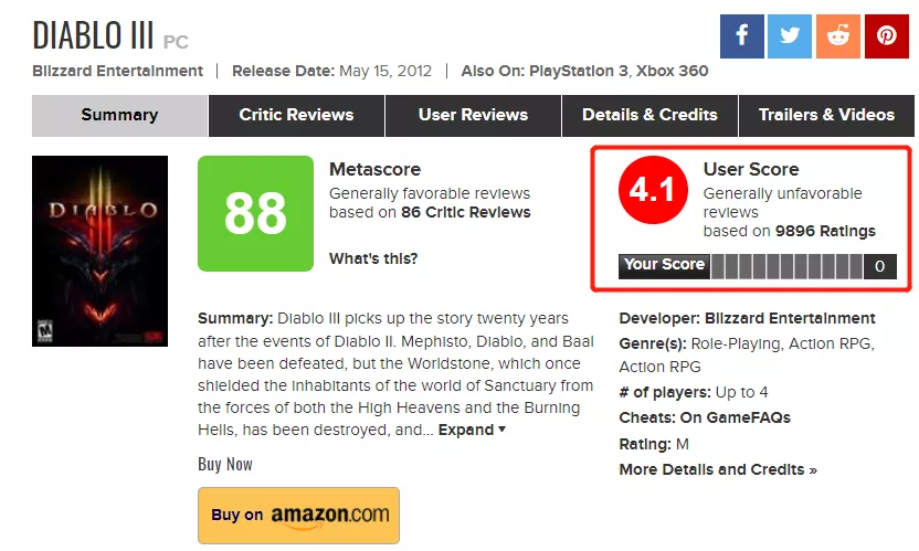 幫助暴雪確立地位的老IP也沒能繼續創造奇蹟,《星際爭霸2》在運營10年後正式停止更新,《暗黑破壞神3》在MTC上的用户評分僅4.1分,連2代8.8分的一半都不到。