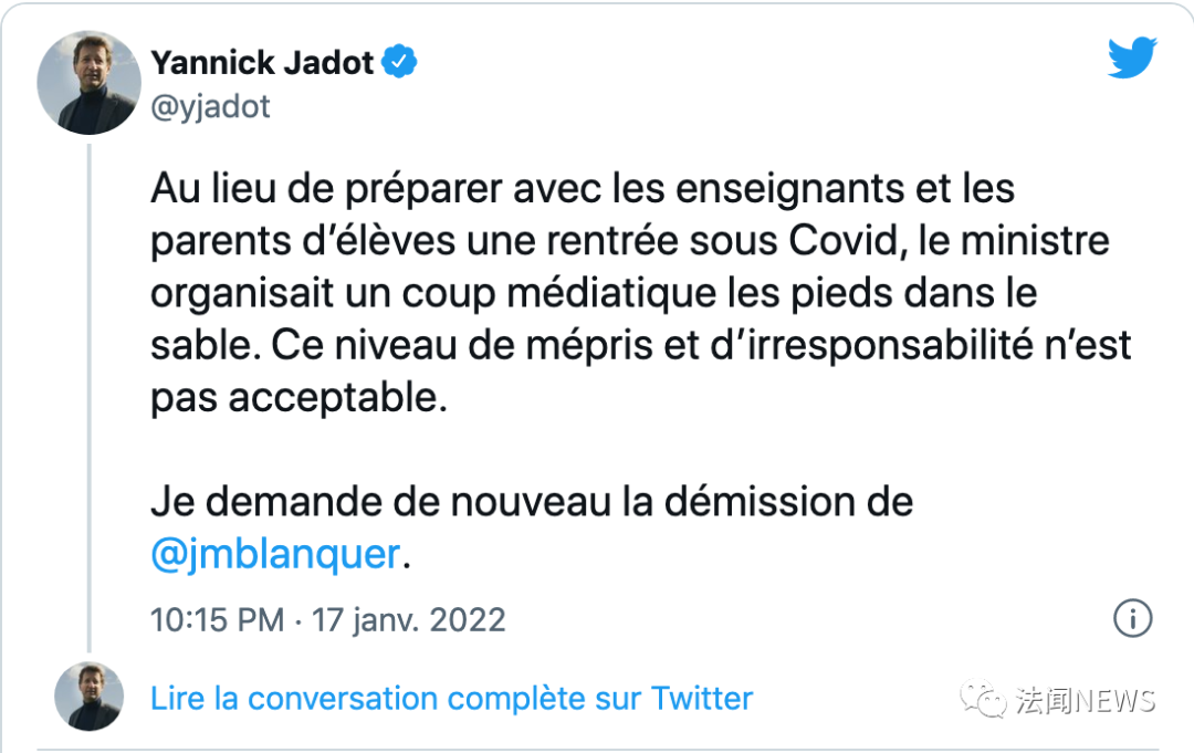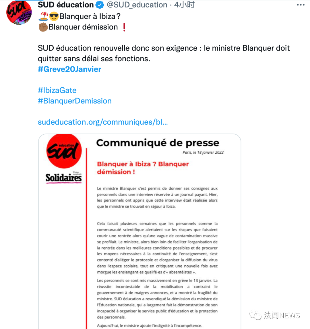 週一晚上,據Mediapart報道,在1月新學年開始之前,也就是1月2日週日那天,教育部長Jean-Michel Blanquer接受《巴黎人報》採訪時,公佈了當時學校新學年新的衞生章程大致內容,而他當時其實正在Ibiza島度假。