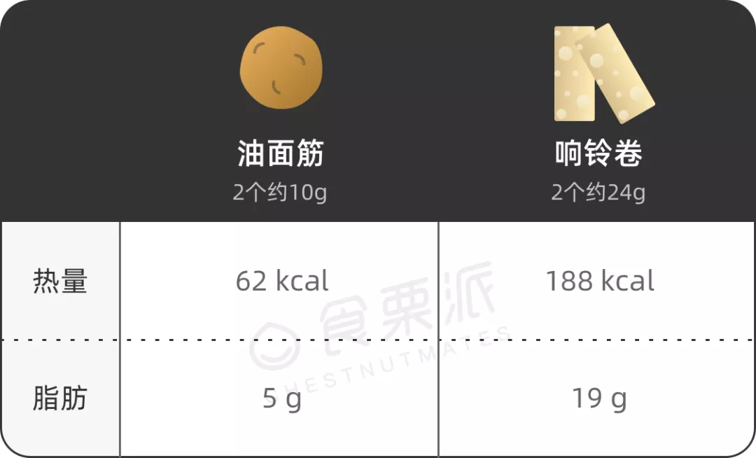 雖然響鈴卷份量輕,一個不到30g,但是吃2個,熱量也相當於一小碗米飯了。