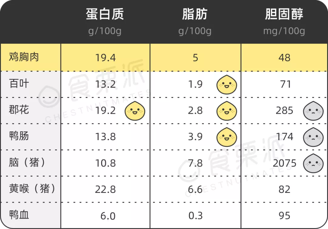 豬腦8成以上是水,熱量不太高,跟雞胸肉差不多;但是膽固醇含量是雞胸肉的**4****0多倍!**一副豬腦花(90g)所含的膽固醇,相當於8、9個雞蛋黃。