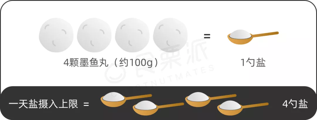比如墨魚丸,鈉含量大多在500mg/100g左右。吃4顆這樣的丸子,鈉(鹽)的攝入量就到每天推薦吃鹽量的1/4了。