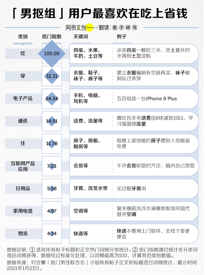 根據“網易數讀”的研究,在摳門方法上,摳男、摳女們各有側重。
