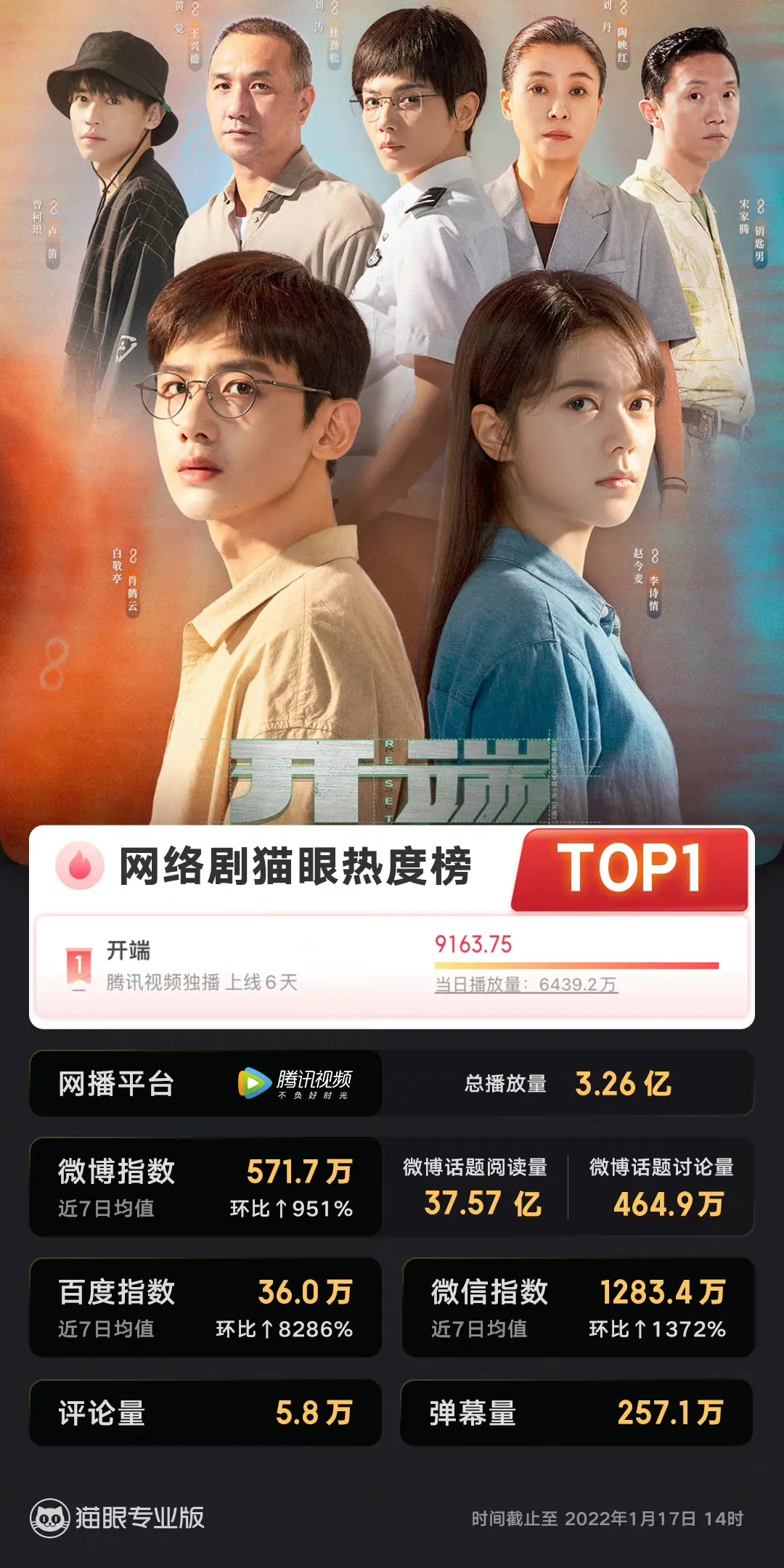 1月11日,《開端》正式開播,接下來的一週裏,憑藉較為新穎的設定、緊湊抓人的劇情、全員到位的表演迅速出圈。從開播第一天起,《開端》便穩居豆瓣實時熱門書影音第一名;隨着口碑持續發酵,開播第四天,就強勢登頂貓眼全網網絡劇熱度榜、且蟬聯榜首,在全網劇集排行榜則升至第二名,僅次於《王牌部隊》;開播第五天,劇集播放量破3億,豆瓣更是開出8.2的高分。可以説,《開端》做到了熱度與口碑雙豐收,成為2022年影視劇隊列的一個良好“開端”。