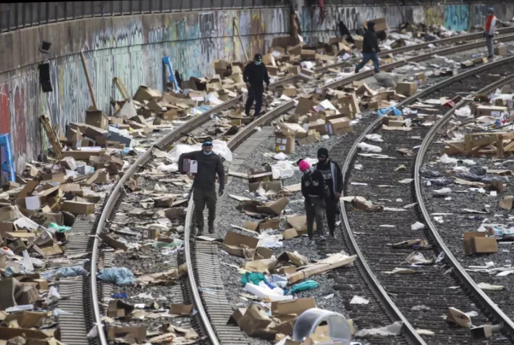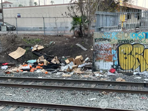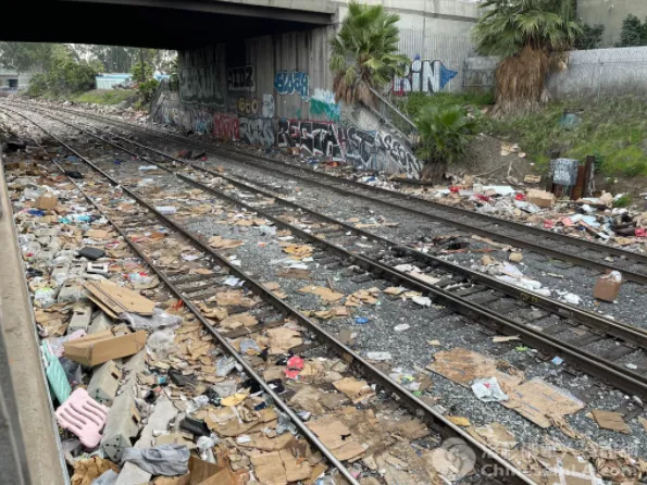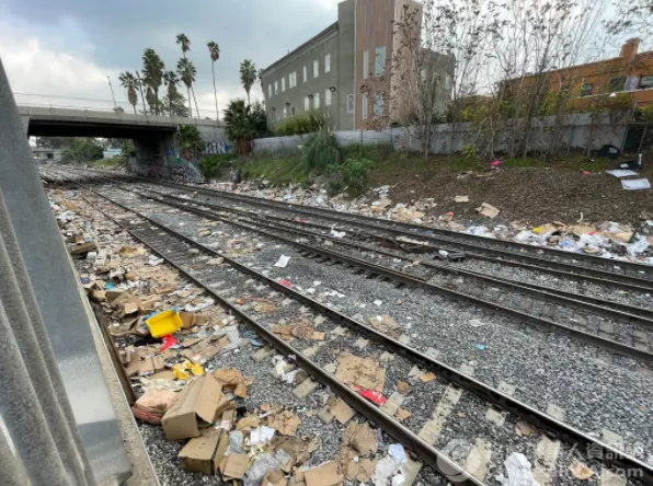 聯合太平洋鐵路公司(Union Pacific)表示,在過去一年中,洛杉磯縣的鐵路盜竊案件增加了160%。該公司表示,**在過去的三個月裏,包括繁忙的假日季,這個問題更加嚴重,平均每天有90多個集裝箱被破壞。**大量的快遞包裝、紙盒紙箱、不值錢的商品散落在鐵軌及周圍。