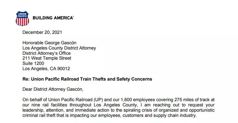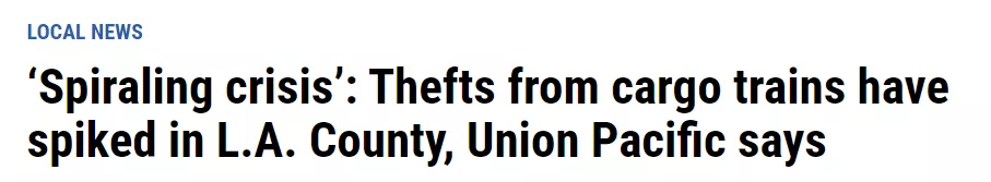 信中寫道:“即使拘留了所有偷盜的人**,但零保釋金政策和嫌疑人出庭時間的拖延,導致聯合太平洋鐵路公司再次受到這些罪犯的傷害。”**聯合太平洋公司表示,**那些被拘留的人“向我們的警員吹噓,指控將被簡化為簡單的非法侵入,根本不會造成嚴重後果。”**信中寫道,由於這些盜竊案,聯合太平洋公司已經看到UPS和FedEx等客户試圖對運營計劃做重大調整,以避開洛杉磯縣。