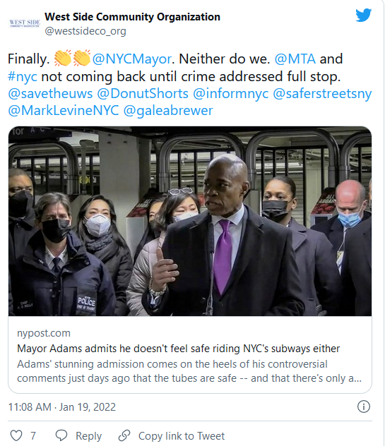 「第一天,1月1日,當我乘坐火車時,我看到了遊民在清早的列車上大喊大叫,更看到了站台外的鬥毆行為。」他在記者會上説,「我知道我們有工作要做,我們將兼顧兩者——要降低犯罪率,也要確保紐約人在地鐵系統中感到安全。」