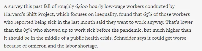 他們在去年秋天對大約6600名低收入小時工進行了一項調查,發現確診員工中有65%的人表示他們還是去上班了。這低於疫情爆發前生病工作的85%,但遠高於公共衞生危機期間應該出現的情況。