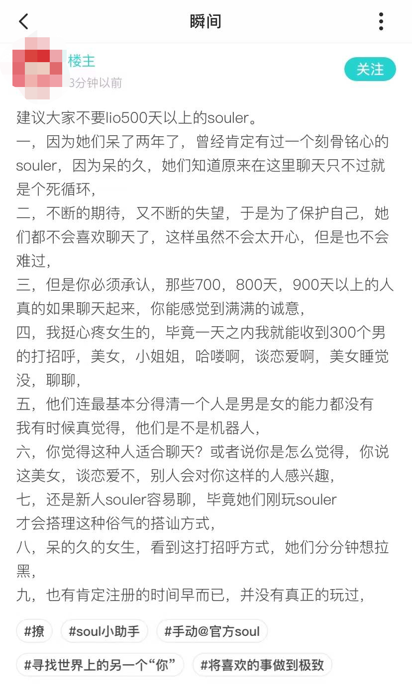 在Soul廣場上,一些“相親警告”般的話在反覆流傳:“別去招惹那些xxx天以上的人。他們大多已經在Soul認識過一個難忘的人。你的一句你好、在嗎,在他們看來乏味至極。一開始,他們可能也不是為了相親來到這裏的。”