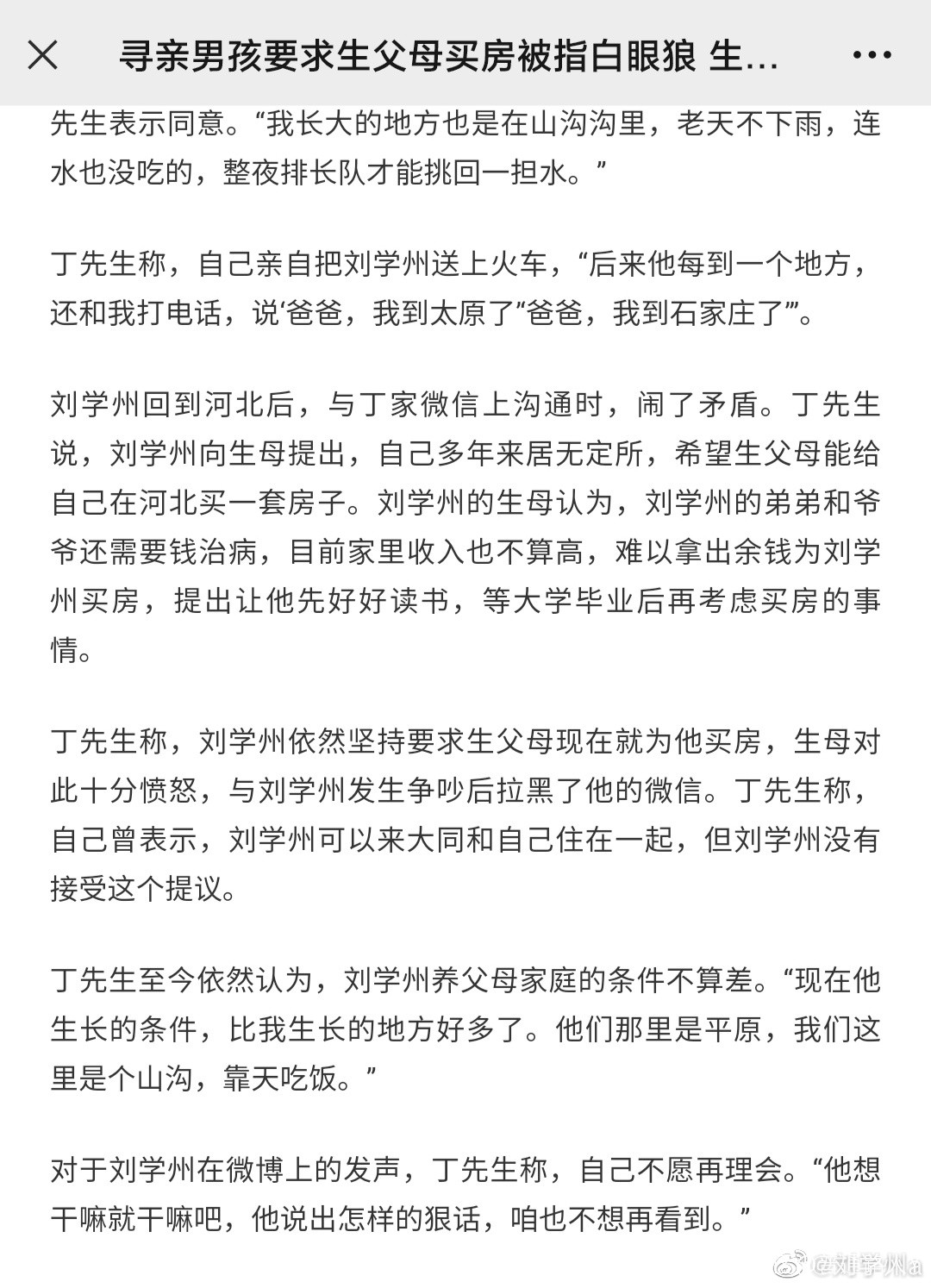 而同時也有媒體採訪了劉學州的生父丁某,丁某在劉學州和其生母發生爭執後曾表示願意與劉學州一起居住在大同,但劉學州拒絕了這個提議。
