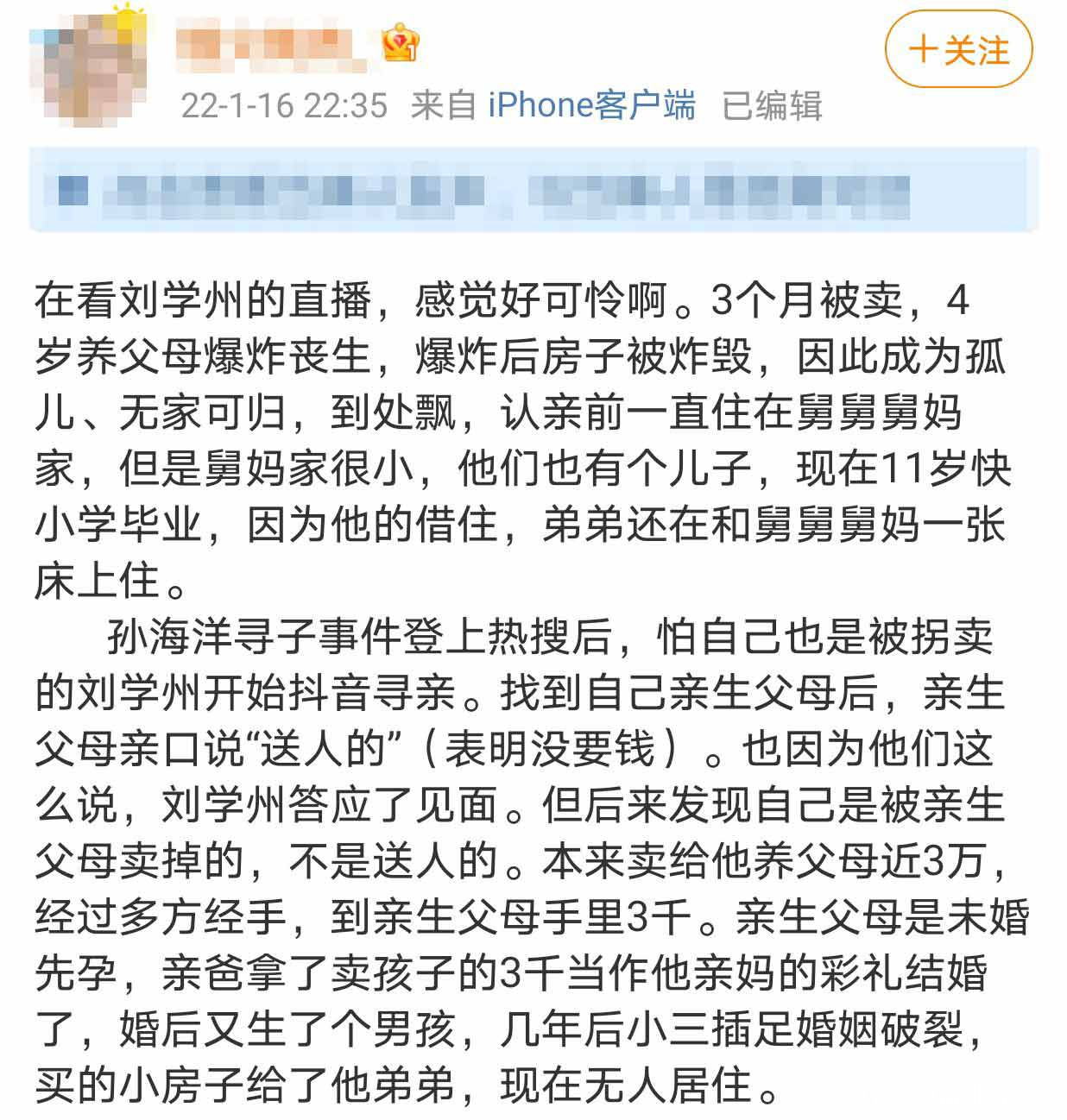 不過網友爆料稱,劉學州在直播的時候曾透露過自己被拐賣後的生活經歷,自己4歲的時候,養父母的家因為不明原因的爆炸而毀於一旦,養父母也在爆炸中不幸離去。