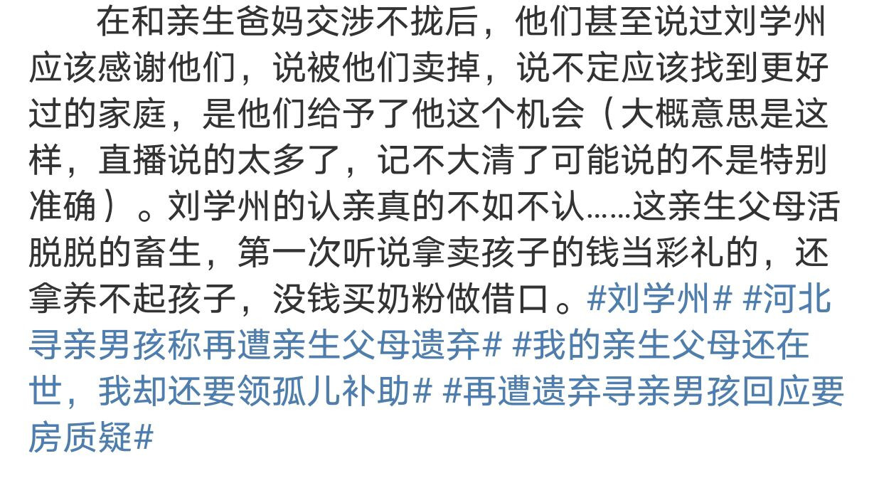 最近,河北尋親男孩劉學州被自己生母拉黑的事情依舊在持續,有媒體曝出説劉學州被親生父母“再次拋棄”,很有可能是因為買房問題導致母子二人不歡而散。