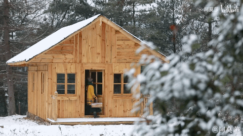 到了冬天,畫面裏如願出現了童話世界的那間小木屋,看到這裏才真的明白,有的人真的可以把生活過成詩。