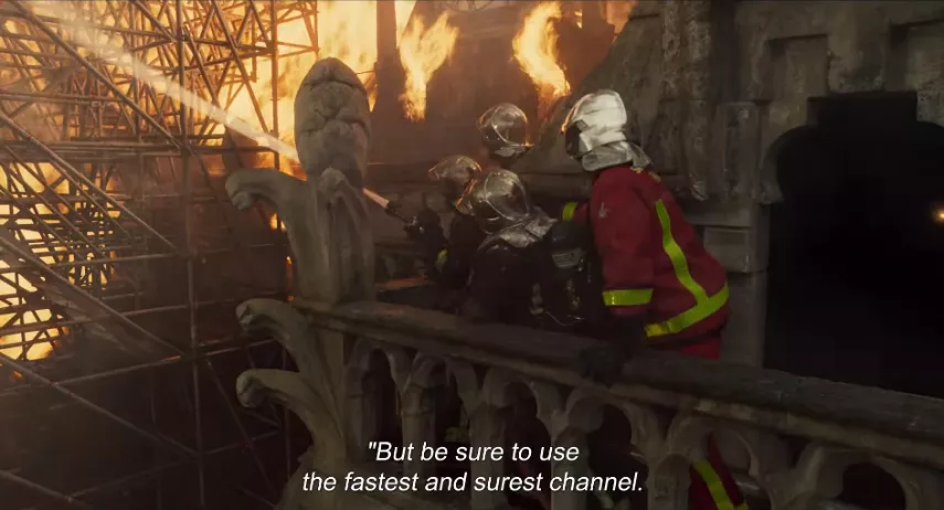 《燃燒的巴黎聖母院》於2021年12月推出了預告片。影片介紹寫道,這部電影將追溯當時的人們“如何冒着生命危險完成令人敬畏的救援”,片中也展示了數個巴黎聖母院熊熊燃燒、消防員深入火場的鏡頭,並引用了巴黎消防隊的倫理道德規範來表達致敬之情: