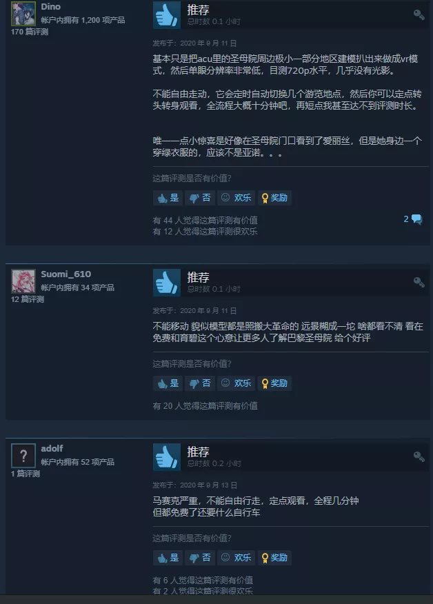 然而《巴黎聖母院:時光倒流》僅是把玩家侷限在數個地點與角度定點觀賞,並不允許玩家自由行走。而且用2020年的標準來看,2014年的建模水平已經落後,遊戲中聖母院的模型達不到完全擬真的地步。