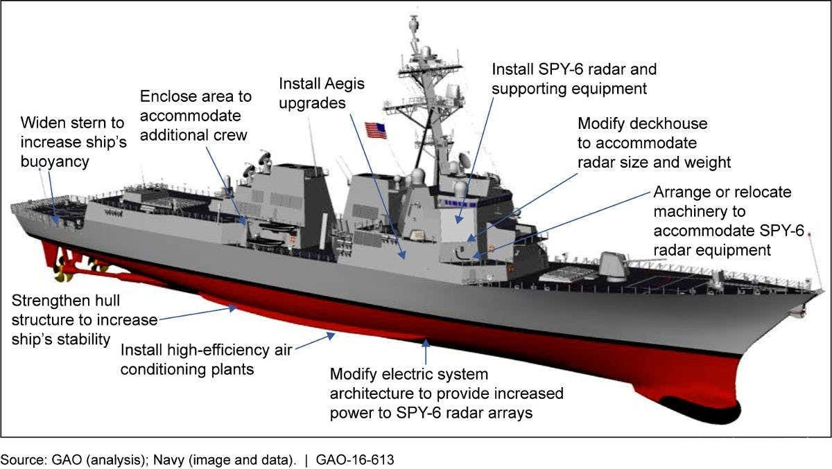 對於“伯克”級進一步升級的壓力首先來自反導需要。SPY-6雷達不僅是主動相控陣,性能有顯著提高,還是雙波段的,用S波段的大陣面進行遠程搜索(包括反導),用X波段的小陣面進行火控。但“伯克”級的基本船型不適合安裝沉重的全尺寸的SPY-6,安裝位置較高的X波段陣面對重心影響太大,最要命的是“伯克”級的動力已經提供不了所需要的電力和製冷要求。