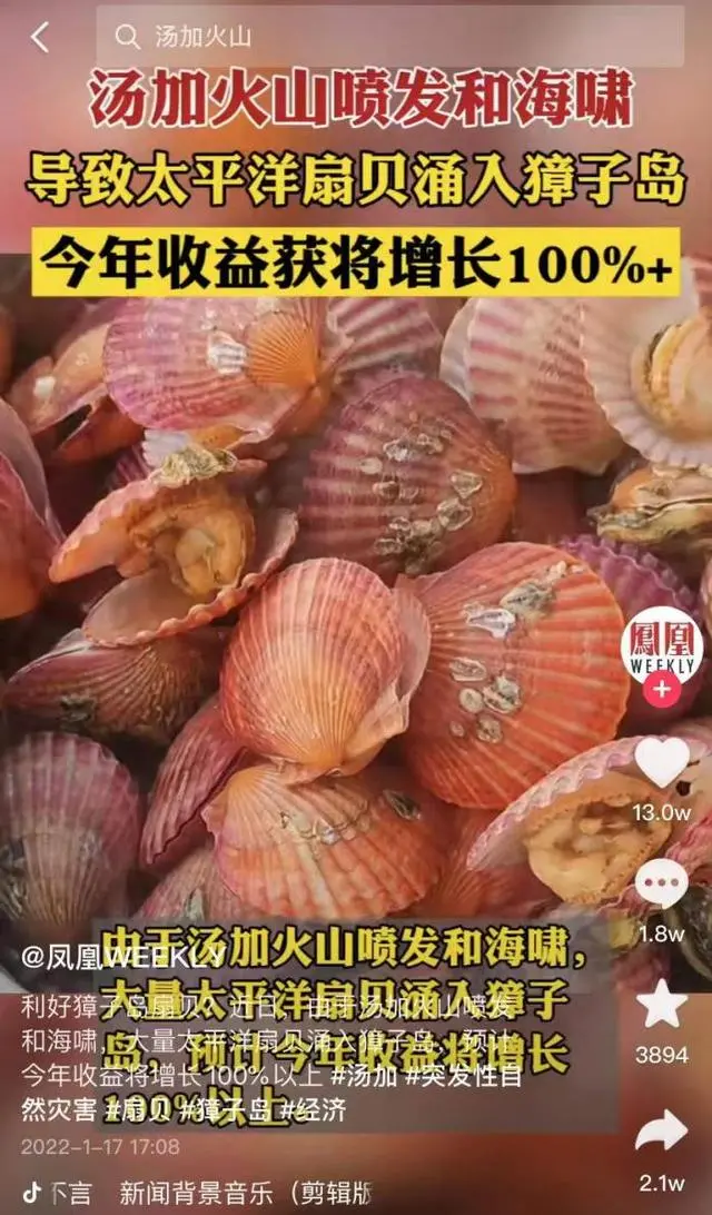 17日晚間,一則“湯加火山爆發導致大量太平洋扇貝湧入獐子島,今年收益獲將增長100%+”的視頻在網上流傳。雖然公司回應稱:“尚不清楚上述情況”,但股價卻扶搖直上。截至發稿,獐子島漲停,報4.26元。