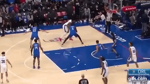 所以他進攻端和甜瓜的毛病也類似:投籃選擇比較飄忽,劃拉一下就起了……恩比德一個長人,生涯命中率49%;甜瓜那麼壯的體格,生涯命中率45%。