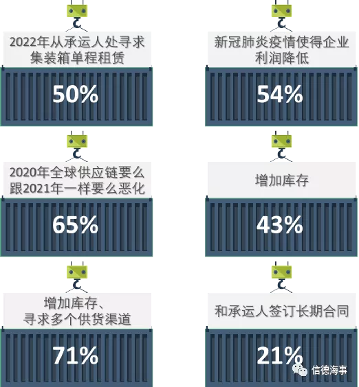 Container Xchange還面向全球各地800位物流行業的從業者展開了對2022年集裝箱租賃設備方面的調查。調查結果顯示,50%的受訪者準備在2022年從承運人處尋求集裝箱單程租賃,54%的人表示新冠肺炎疫情使得企業利潤降低。在對未來的預計上,65%堅信,2022年全球供應鏈狀況不會有所好轉,要麼跟2021年一樣要麼更加的惡化。鑑於此,43%的受訪者選擇通過增加庫存來應對危機,高達71%的受訪者説他們不但會增加庫存,還會努力尋求多個供貨渠道。令人略感驚訝的是,雖然集裝箱運輸現貨市場波動風險如此之大,且大多認為2022年情況不會有所好轉,但僅有21%的受訪者願意和承運人簽訂長期的合同。